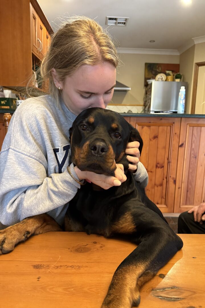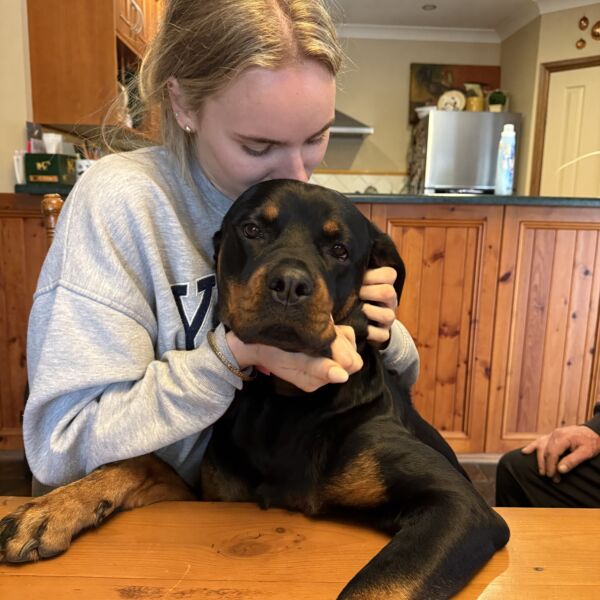 At home, we're big Rottweiler lovers. We currently have a beautiful Rottweiler named Ruby, who is full of personality and always getting into trouble, but we wouldn't have it any other way. She has brought so much love and joy into our lives and can be such a cuddle bug!
